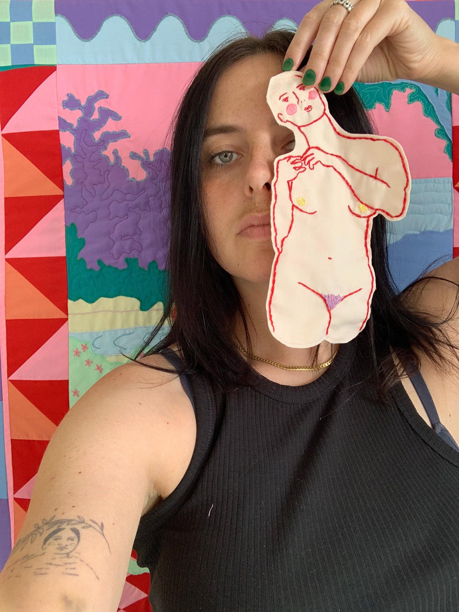 Claudia Klaus blurs the boundaries between painting and quilted textile art through her signature Padded Paintings, handmade quilts mounted on wooden frames. Each merge art history, domestic craft, and whimsical reimagination.